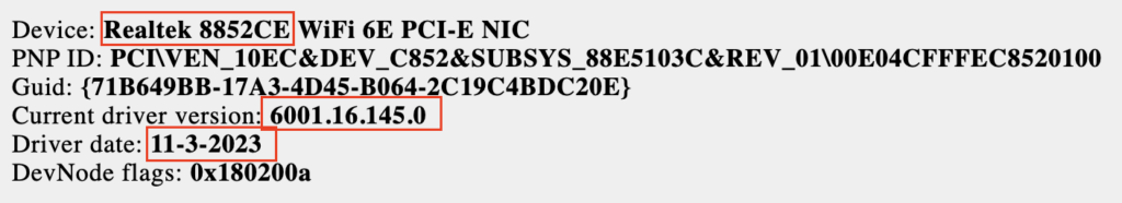 Almost 2 full months later (April 2025), Realtek eventually acknowledged that there was a known issue with their drivers and that they had already provided a fix to the OEMs (January 2025). Although they kept us in the loop on the confirmation of when Dell and HP would make them available to their customers, they never provided us with a root cause. That bothered me, but I had to move on as this was an extremely busy time for us. It wasn’t until this topic was accepted as a talk for WLPC 2026 that I took more time to try and discover what the root cause really was and while I did reach out once again to Realtek to ask if they could just tell me, I never heard back from them. To help me discover the root cause, I once again turned to my Python script along with a test laptop that Josh sent me.
