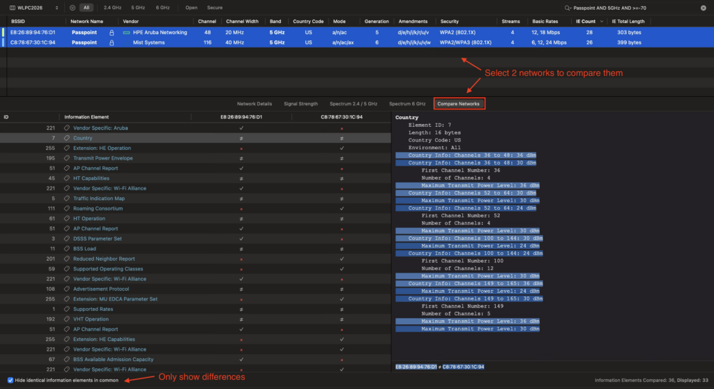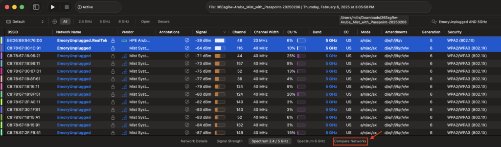 While we were at the Psychology building and both the Aruba and Mist APs were online in the same environment, I was able to capture the SSIDs broadcasted using the WiFi Explorer Pro 3 (WFE Pro 3) WLAN analyzer app from Intuitibits. This app has a great “Compare Networks” feature that doesn’t get enough attention in my opinion. With 2 SSIDs selected, you can see the similarities and differences, or just the differences between them.