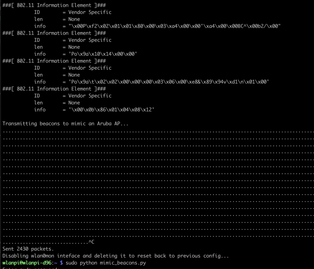 Without the ability to add/remove certain specific information elements (IEs) in the Aruba config, how could we test the differences in IEs by adding or removing them one at a time? Well, while in Phoenix at WLPC 2025, I remembered that the WLAN Pi project has a tool called Profiler managed primarily by my friend Josh that essentially mimics an AP to aid in capturing a client’s capabilities. The Beacons that are sent out by the WLAN Pi are generated by Python code using the Scapy package. I reached out to Josh about my idea of using Scapy to do the same, but with the Passpoint SSID and he agreed that it would be possible so off I went the weekend after WLPC 2025 to learn more about Scapy and give it a go.