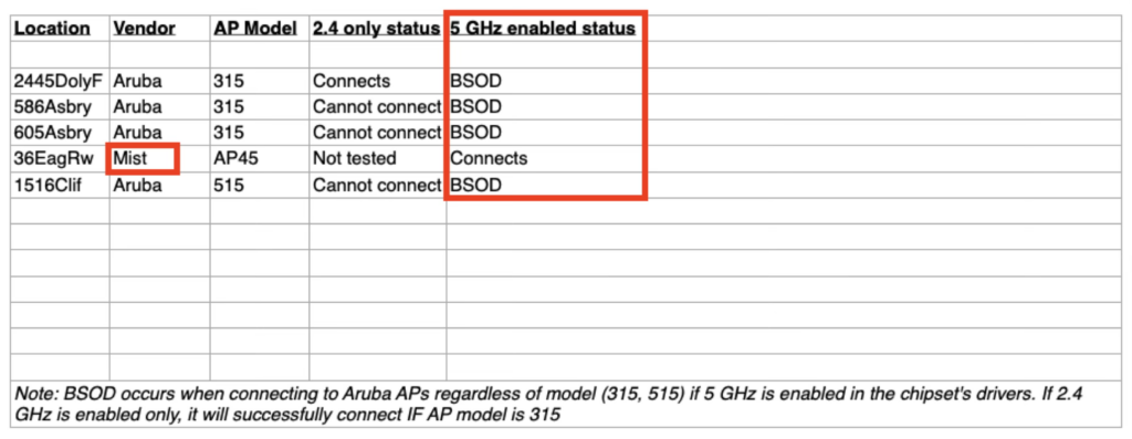 Let’s fast forward a little to the end of January when I was planning on making a visit to the campus. (I’m a remote worker and I do not live in the metro Atlanta area so I have to schedule and coordinate visits to campus.) One of the things I wanted to look at while visiting the campus was this BSOD issue. I asked our contact to hold onto one of the problematic devices for my visit and they obliged. When we arrived on site, we did some basic testing and were able to recreate the issue. The university building we were in was an Aruba building. Knowing that they didn’t seem to have issues at the lone Mist site they tested in, the Psychology building, I called for a field trip. What we found at the Psychology building was pivotal in identifying the issue. We could not recreate the issue in that building when just the Mist APs were online and broadcasting the same exact*** SSIDs.