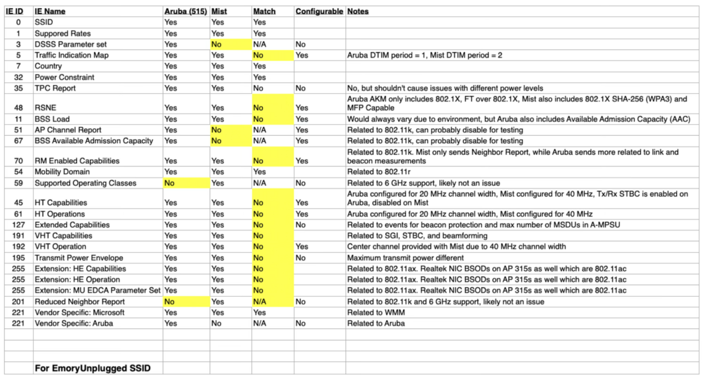My inclination was that it had something to do with one of our WPA2-Enterprise SSIDs, especially with the comment that the problem didn’t occur off campus. As you know, most homes and customer-facing businesses (think Starbucks as an example) run SSIDs as Open or with a passphrase. So we removed EmoryGuest from the equation which was our only open or passphrase-based SSID. My next hypothesis was that it could be related to 802.11r or Passpoint. 802.11r has often caused problems with clients that don’t support it so in my mind it was definitely a suspect and since Passpoint is unique in that it has additional information elements in the beacons and probe responses, it was also a suspect. For the EmoryUnplugged SSID, 802.11r was enabled on both vendors so this ruled out .11r in my mind.
