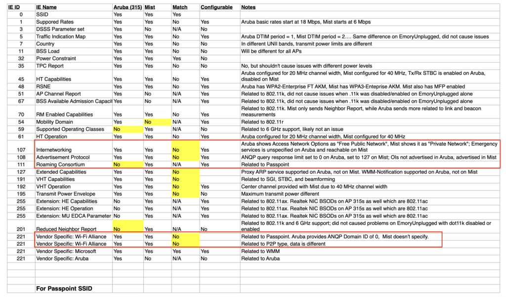 I’m a very visual person so I used this ability in WFE Pro 3 to create these two spreadsheets to highlight the differences in the the two suspected SSIDs. This allowed me to hone in on not only the differences, but the things I felt could actually be the cause of this problem. As you can see, while there were several differences for both SSIDs, there were a lot of differences specifically with relation to Passpoint or HS 2.0.